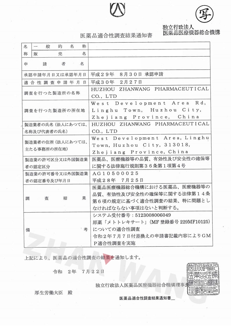 2020年8月17日,湖州展望藥業(yè)有限公司收到日本“獨(dú)立行政法人醫(yī)薬品醫(yī)療機(jī)器総合機(jī)構(gòu)(PMDA)”簽發(fā)的醫(yī)藥品適合性調(diào)查結(jié)果通知書,確認(rèn)公司產(chǎn)品甲氨蝶呤通過日本PMDA認(rèn)證,符合GMP(藥品生產(chǎn)質(zhì)量管理規(guī)范)。