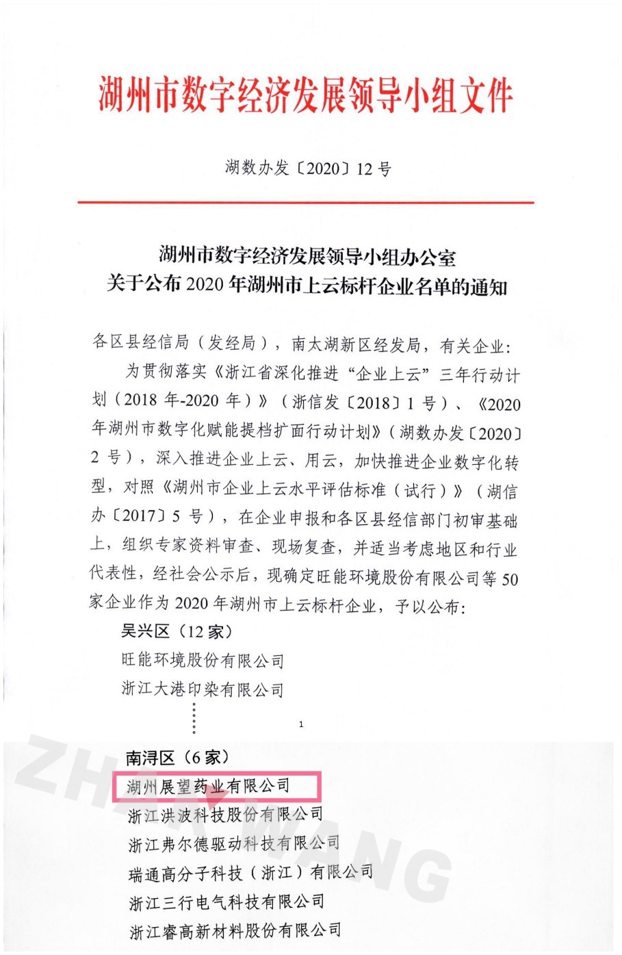 近日,根據(jù)湖數(shù)辦發(fā)〔2020〕12號文件《湖州市數(shù)字經(jīng)濟發(fā)展領導小組辦公室關于公布2020年湖州市上云標桿企業(yè)名單的通知》,湖州展望藥業(yè)有限公司被評為“2020年湖州市上云標桿企業(yè)”。