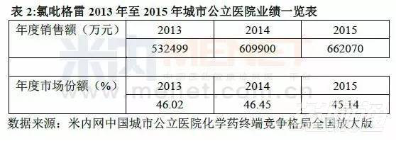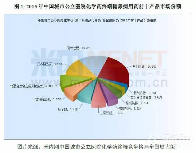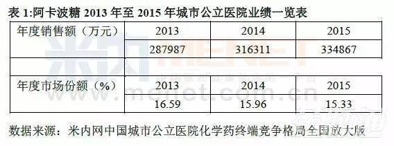 從圖1可以看出,阿卡波糖在2015年中國城市公立醫(yī)院化學藥糖尿病用藥的市場份額是15.33%。結合表1可知阿卡波糖在城市公立醫(yī)院中的年度銷售額逐年增長,2015年的銷售額達到334867萬元。借助進入2012版基藥目錄的契機,阿卡波糖將實現(xiàn)放量增長,仍有較大的成長空間。