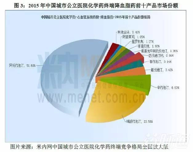 由表3可知2015年城市公立醫(yī)院化學藥降血脂藥市場中阿托伐他汀的銷售額呈現(xiàn)增長的趨勢,2015年達到了615044萬元,同比上一年增長了13%。2015年的市場份額為51.68%,較2013年稍有下降但結合圖3可知阿托伐他汀以絕對優(yōu)勢領先于其他降血脂藥,占據(jù)降血脂藥的半壁江山。