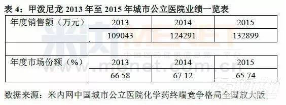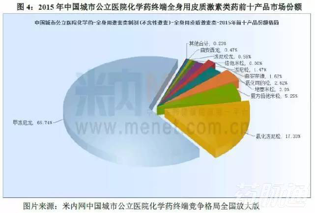 由表4可知甲潑尼龍在2013年至2015年城市公立醫(yī)院化學藥全身用皮質(zhì)激素類藥中的銷售額呈現(xiàn)上升的趨勢,2015年的銷售額為132899萬元且其所占的年度市場份額較大,結合圖4可知甲潑尼龍以65.74%的高份額位居榜首,居第二的氫化潑尼松的份額占17.32%,這充分說明其在全身用皮質(zhì)激素類藥品中的龍頭地位。