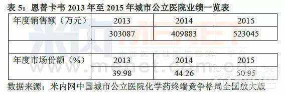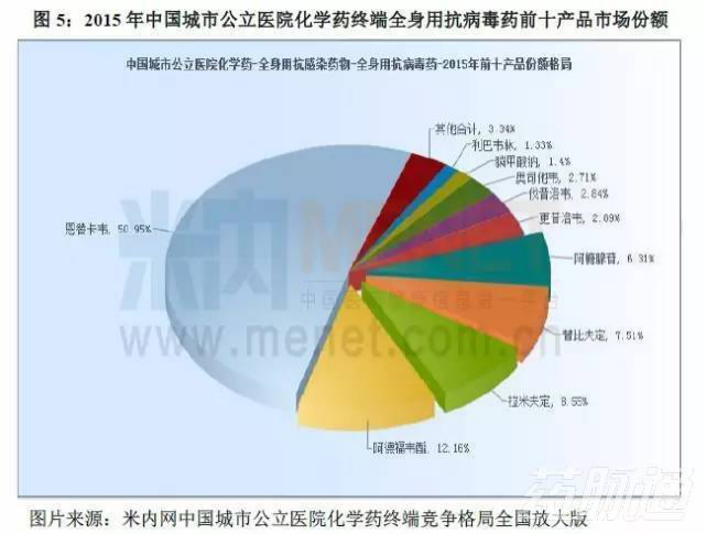 由表5可知恩替卡韋在2013年至2015年城市公立醫(yī)院化學藥全身用抗病毒藥中的年度銷售額和市場份額均呈現(xiàn)增長的趨勢,2015年的銷售額達523045萬元,市場份額占到50.95%,結合圖5可以看出恩替卡韋在全身用抗病毒藥中的絕對領先地位。