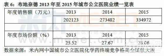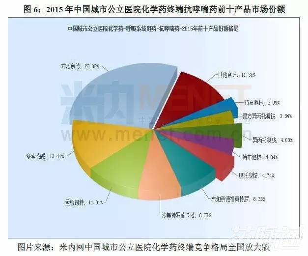 從表6可以清晰地了解到布地奈德2013年至2015年城市公立醫(yī)院化學藥抗哮喘藥中的銷售額和市場份額均在逐年增長,2015年的銷售額為334972萬元,市場份額占比28.06%,結合圖6可以看出,布地奈德在抗哮喘藥中占據(jù)較大份額。